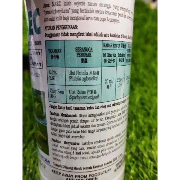 ARON 5.4SC IALAH SEJENIS RACUN SERANGGA YANG MENGANDUNGI PERAWIS AKTIF DARIPADA KUMPULAN BENZOYLPHENYLURE YANG BERTINDAK SECARA KERACUNAN PERUT DAN IA MENGHALANG PEMBENTUKAN KITIN ATAU AGEN ANTI SALIN KULIT BAGI MENGAWAL LARVA DAN PUPA LEPIDOPTERA.