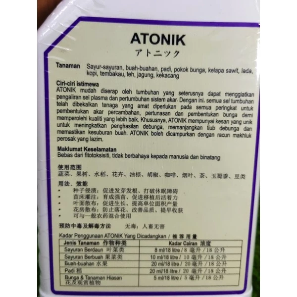* ATONIK bebas dari fitotoksisiti, tidak berbahaya kepada manusia & binatang Kadar penggunaan yang dicadangkan :