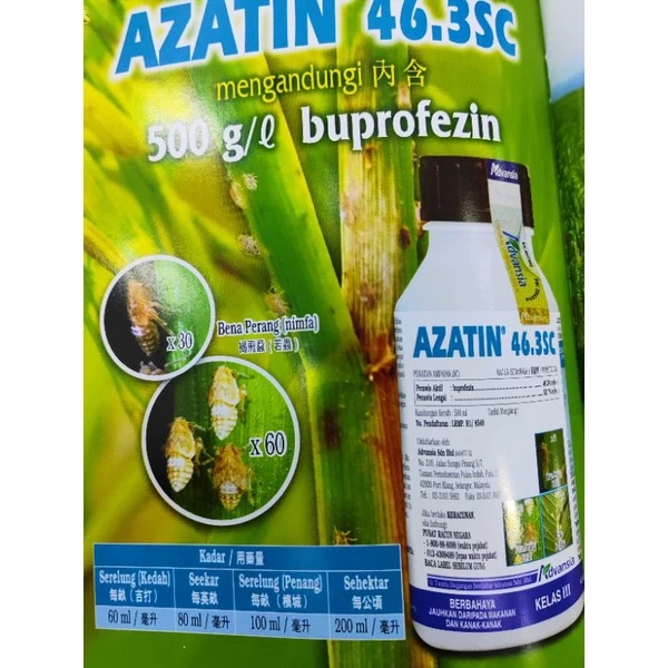 AZATIN 46.3SC: An insect growth regulator containing Buprofezin at 46.3% w/w as the active ingredient, formulated as a Suspension Concentrate (SC) available in 250 ml and 500 ml packaging. Classified under IRAC Group 16, AZATIN 46.3SC inhibits chitin synthesis in larvae and eggs, effectively disrupting the development of target pests and providing reliable control against them.