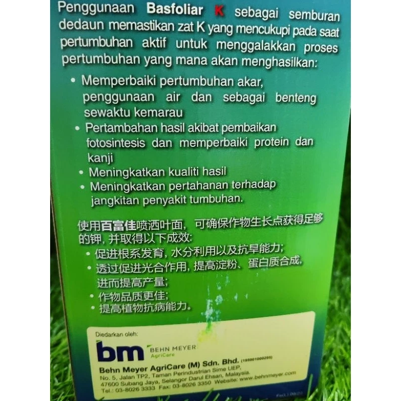 Penggunaan Basfoliar K sebagai semburan dedaun memastikan zat K yang mencukupi pada saat pertumbuhan aktif untuk menggalakkan proses pertumbuhanyang mana akan menghasilkan :