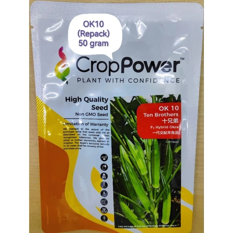 Ten Brothers OK10 is the newest variety with long cropping, high yielding and most resistance towards green hopper attack. Each plant has super high branching, short internode and concentrated fruiting with higher yield. The pods can be harvested at 35 days with super shiny and attractive dark green fruit for best market preference.
