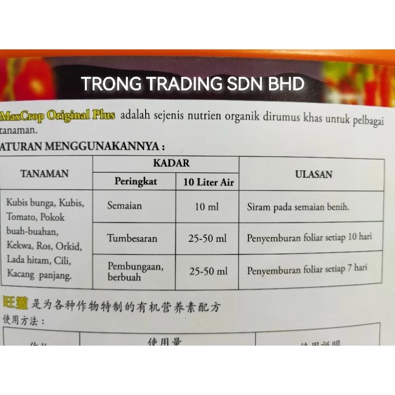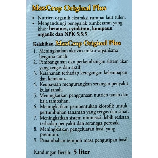 MaxCrop Original Plus Nutrien organik ekstraksi rumpai laut tulen. Mengandungi penggalak tumbesaran yang khas: betaines, cytokinin, kompaun organik dan NPK 5:5:5 Kelebihan MaxCrop Original Plus