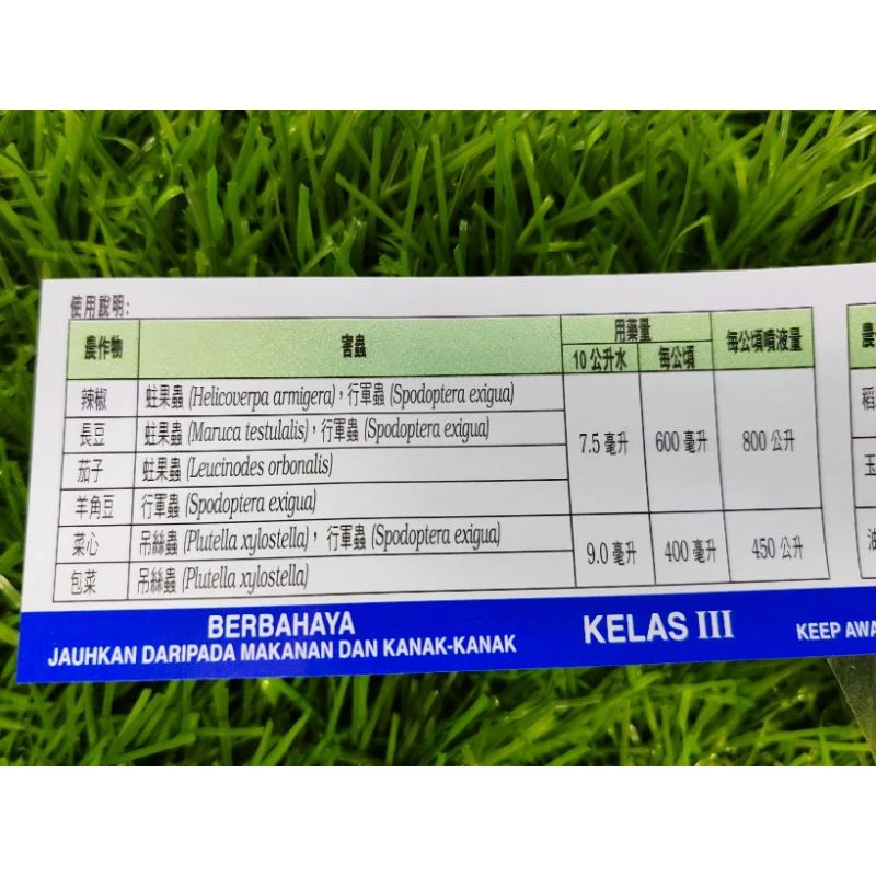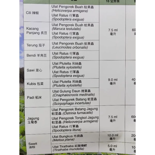 Jangan kutip hasil tanaman jagung dan sawit sekurang-kurangnya 1 hari selepas semburan terakhir; 3 hari bagi sawi dan kubis; 7 hari bagi cili, kacang panjang, terung dan bendi; 14 hari bagi padi.