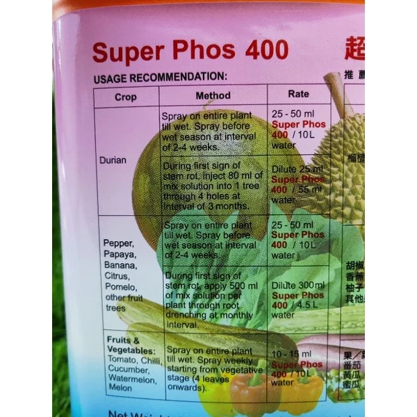 Super Phos 400 Kandungan: Asid fosforus 40% w/w Ciri-ciri: